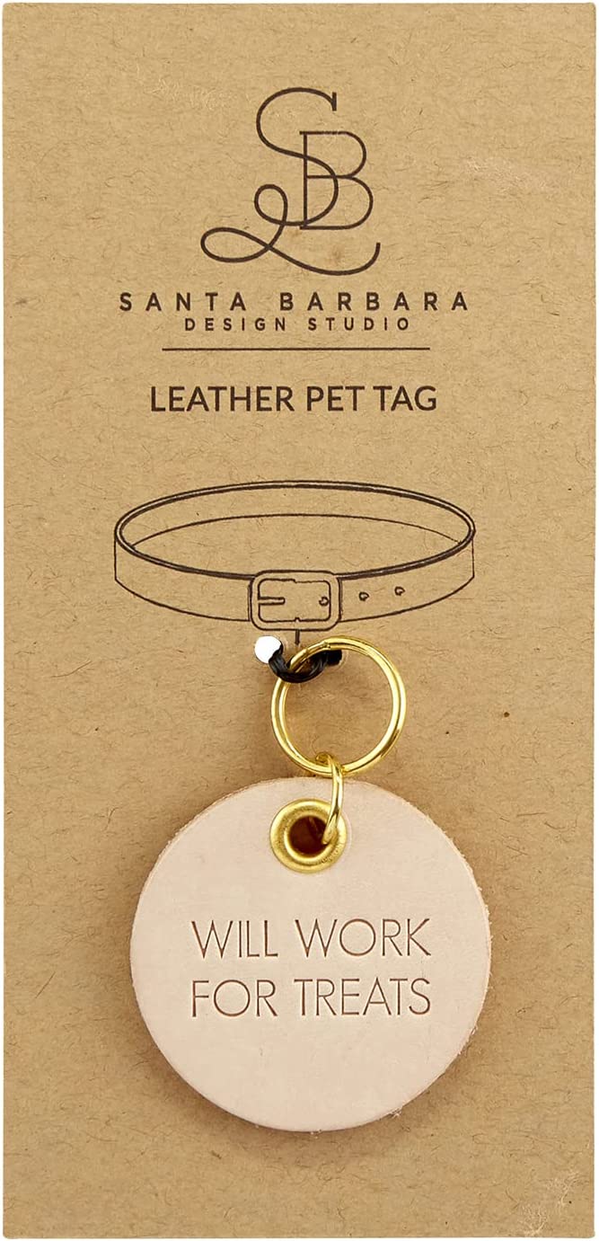 - TAN COLOR: Debossed print reads, "Will Work For Treats"