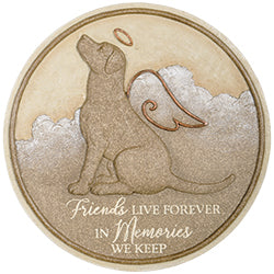 This Dog memorial stone features the sentiment, "Friends live forever in memories we keep.". Our pet memorial stepping stones are cast in resin to emulate the look of sand stone. They are hand painted and feature a keyhole hanger in the back for display.