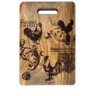 This Acadia Wood Charcuterie Board is Etched with 3 different Roosters and geometric designs. It Measures 9"W x 12" H